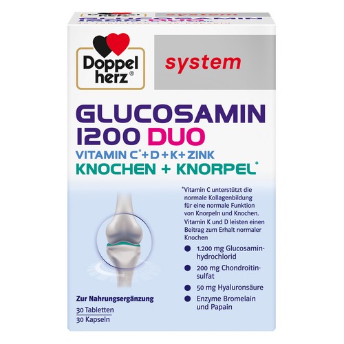 Unser Bewegungsapparat mit seinen Gelenken, Knorpeln, Muskeln, Sehnen und Bändern wird jeden Tag gefordert. Einseitige Beanspruchung, Übergewicht und zunehmendes Alter sind belastende Faktoren. Für den Erhalt der Mobilität und Lebensqualität in jedem Alter können eine ausreichende, schonende Bewegung sowie eine gesunde Ernährung einen Beitrag leisten. Doppelherz system GLUCOSAMIN 1200 DUO enthält Vitamin C, Vitamin D, Vitamin K und die Spurenelemente Zink, Kupfer, Mangan und Selen. Zusätzlich sind 1200 mg Glucosaminhydrochlorid, 200 mg Chondroitinsulfat, 50 mg Hyaluronsäure sowie die Enzyme Bromelain und Papain enthalten.
