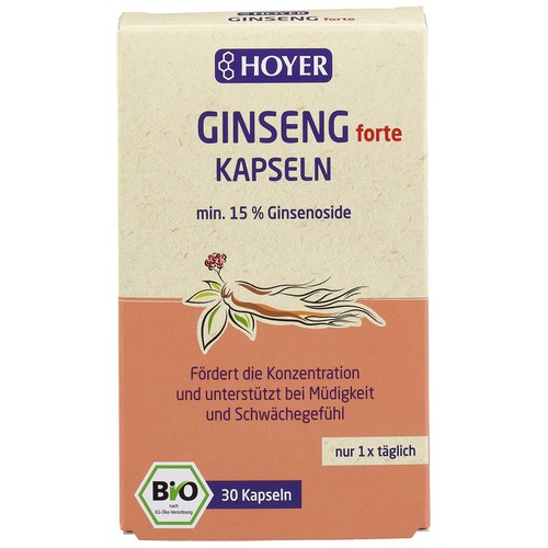 Für die positiven Eigenschaften von Ginseng auf Körper und Geist, sind vor allem die sog. Ginsenoside verantwortlich. Eine Ginsengwurzel benötigt ein Wachstum von 5 bis 6 Jahren um ein Höchstmaß an Wirkstoffen in einem optimalen Verhältnis auszubilden. Nur diese langjährig gereiften Ginsengwurzeln, die in streng kontrolliertem BIO-Anbau kultiviert werden, kommen für die HOYER BIO Ginseng-Kapseln zur Verarbeitung. Die HOYER BIO Ginseng-Kapseln enthalten Ginsenoside in der hohen Konzentration von min. 15 %, die zur Unterstützung bei Müdigkeit und Schwächegefühl und zur Förderung der Leistungs- und Konzentrationsfähigkeit dienen.