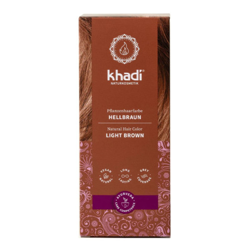 Wertvolle Inhaltsstoffe wie Indigo, Henna, Amla und Bhringaraj sorgen für eine ausdrucksvolle Farbe und geschmeidigen Glanz. Auch graue oder weiße Haare werden mit khadi Hellbraun problemlos abgedeckt.