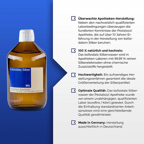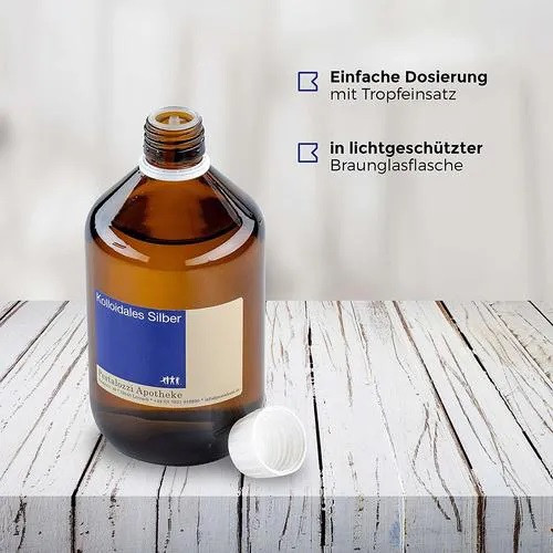 Das kolloidale Silber 10 ppm wird mit hochreinem destillierten Wasser unter qualifizierten Laborbedingungen frisch hergestellt und in einer dunklen Glasflasche geliefert. Die Herstellung erfolgt in der Apotheke unter überwachten Laborbedingungen. Das kolloidale Silber wird auf elektrolytischem Wege mit Hilfe eines entsprechenden Generators hergestellt. Dabei werden aus 99,99% reinem Silber kleinste Partikel gebildet und in destilliertem Wasser verteilt. Wir arbeiten dabei ohne Einsatz von Zusatzstoffen. Bitte beachten Sie: Kolloidales Silber ist kein Arzneimittel und daher auch ohne Angabe einer Indikation. Aus rechtlichen Gründen bieten wir daher das kolloidale Silber nur für technische Zwecke an. Nicht zum Einnehmen.