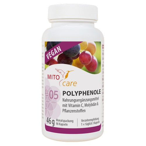 MITOcare Polyphenole vereint 12 wertvolle sekundäre Pflanzenstoffe wie zum Beispiel Curcuma, Schisandra, OPC, Ingwer, Amlabeeren und Granatapfel. Zusätzlich enthält es Vitamin C und Molybdän.